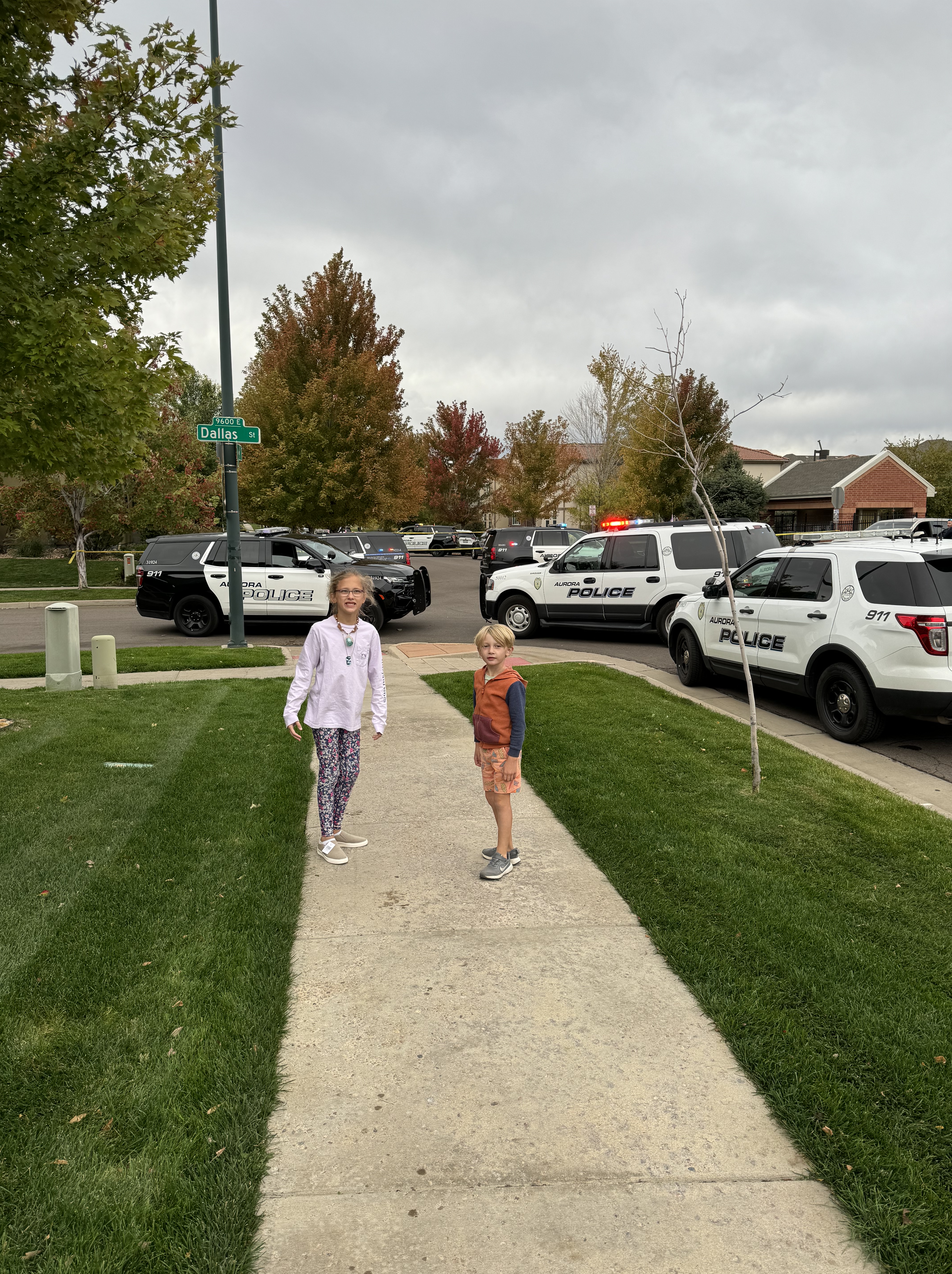 Most alarming was the time I noticed about a dozen cop cars three houses west of the house. They were Aurora police, which means they followed criminal activity from east of Dayton into my neighborhood, which is in the City of Denver. I went to take a look by myself and then took the kids over there. There was no sign of an ongoing threat, but just to make sure I asked an officer and he said, there’s nothing to worry about. Well, great. Time for a photo op. I found out later that night that someone had been shot on the corner three houses west of us. He was in his car. And, after being shot, he was driven eastward into Aurora a couple blocks and died. It was truly tragic. This murder remains unsolved. Since it took place, there’s a small memorial to the victim. I cleaned it up a few times before we moved away.