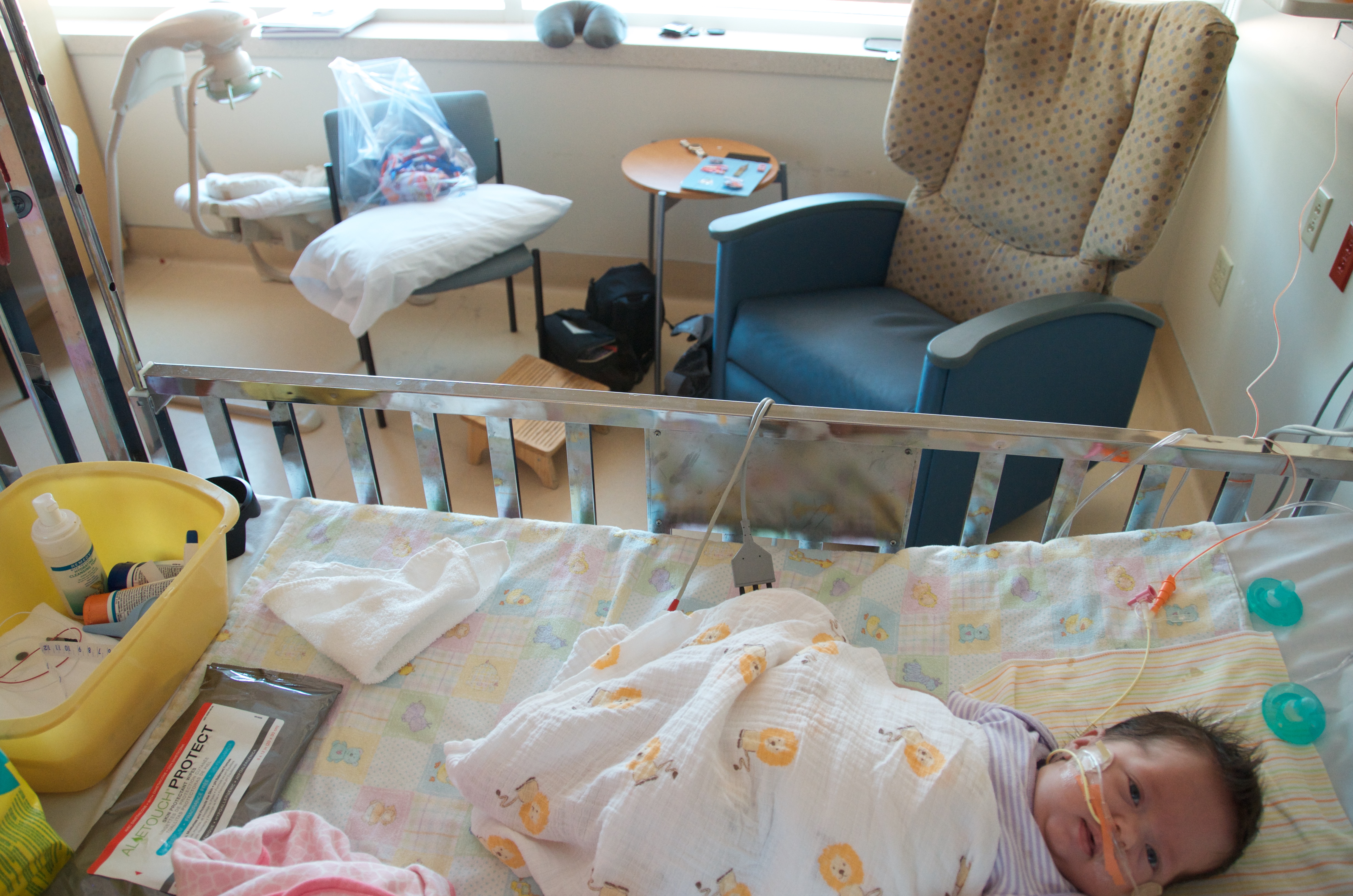 What I did not prepare myself for were the looks we were going to get from people who glanced at our baby. To put it more accurately, the looks our baby would get, the long stares and the double and triple takes. When you take a baby out in public people are inclined to look at him or her. What they do not really expect to see are tender grip cheek stickers holding a nasal cannula in place and an NG tube, held down by an orange strip of tape and wrinkly patches of tegaderm, snaking its way across the baby’s face.