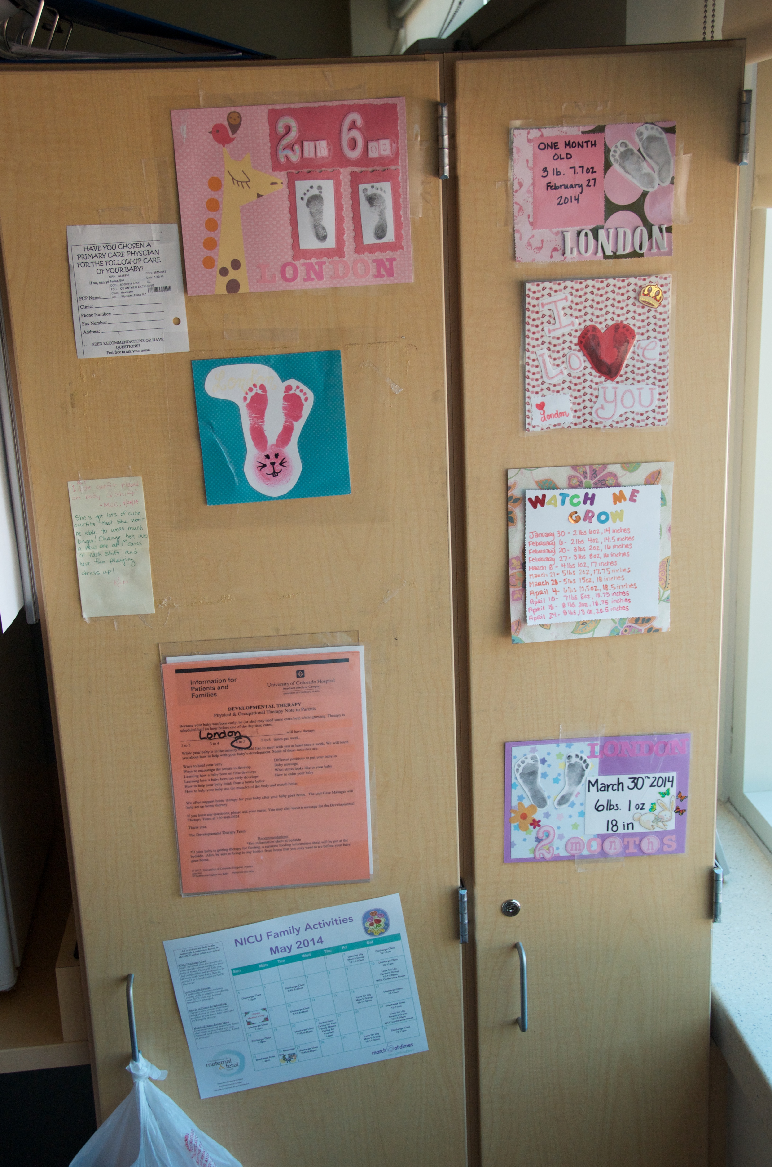 The closet in London’s room with several footprints, a growth chart, a physical therapy schedule, a note from Kate, and the top of a bag holding London’s dirty clothes. Again, just trying to capture it like it was before all this stuff came home with us.