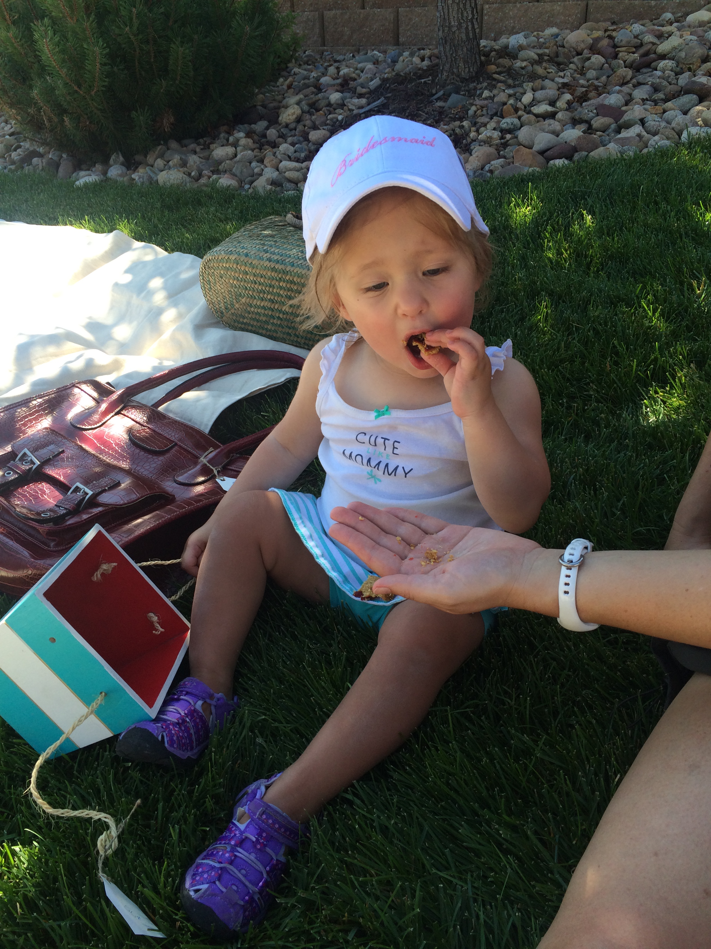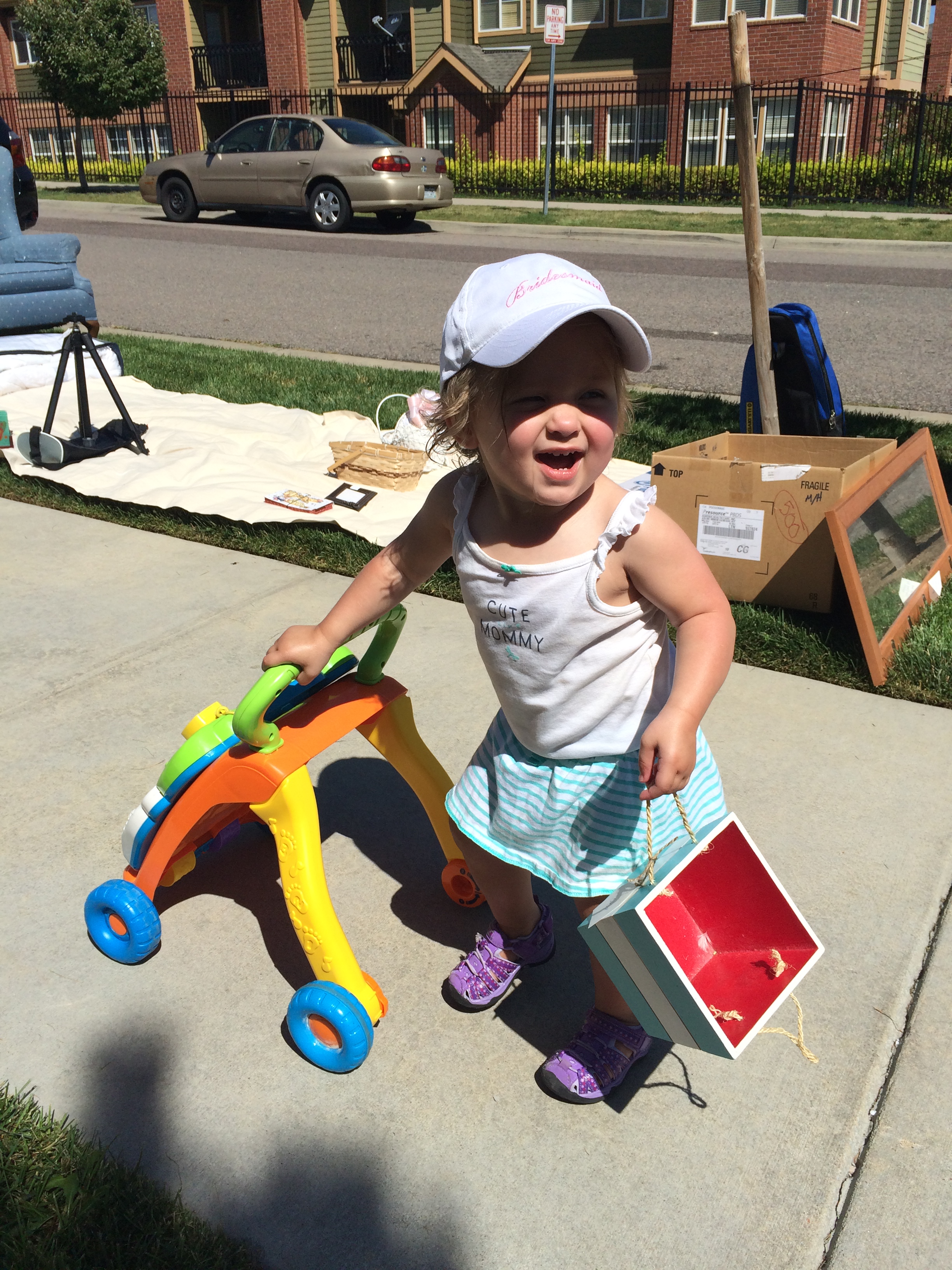 After the early rush of professional garage sale shoppers, who show up early or even before the sale starts, lump everything they want to buy in a pile, and then ask you what you will part with it for, there was quite the lull. I think we didn’t have any interest for an hour. This cute little lady came by with her push toy looking for some deals. She found some shade instead and a granola bar.